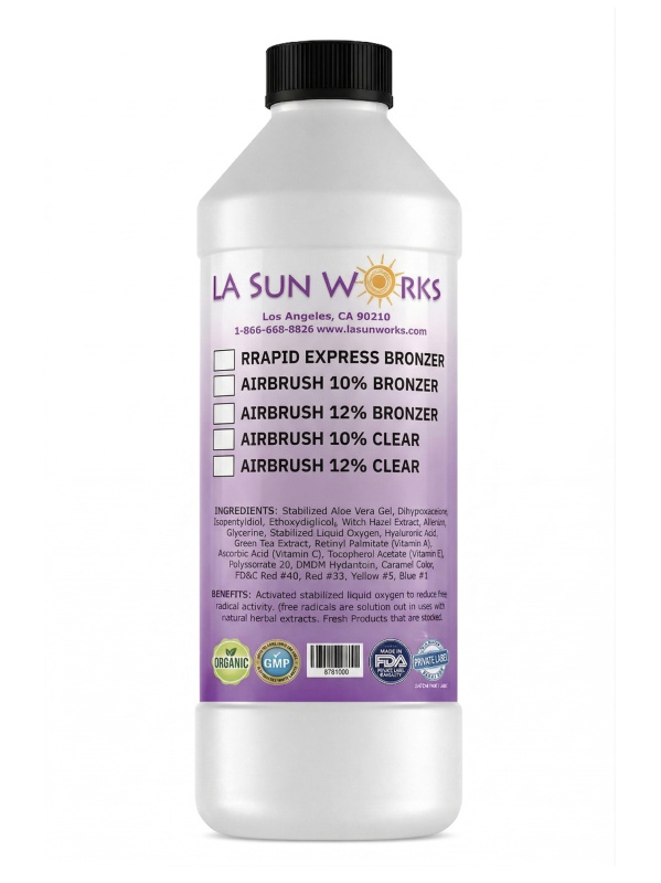 DHA 10%, shower after 4-6+ hours, for a medium dark spray tan, for most skin types including 1 through 5 skin types. For all airbrush, HVLP, automatic sprayer systems. (Custom and private/white label solutions available.)