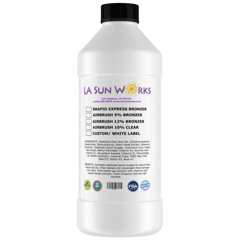 DHA 10%, shower after 4-6+ hours, for a medium dark spray tan, for most skin types including 1 through 5 skin types. For all airbrush, HVLP, automatic sprayer systems. (Custom and private/white label solutions available.)