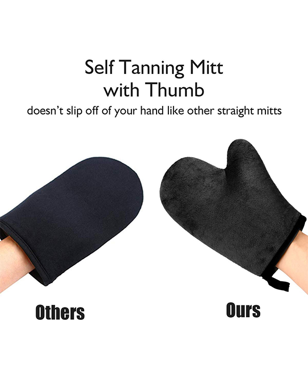 1.Thumb & Mini Tanning Mitts- Tanning mitt with a thumb which keep the mitt in place you want it so it doesn't slip off of your hand like other straight mitts, that providing much more control . The mini finger gloves are perfect for small and delicate areas that need pay attention to such as the face, behind ears, elbows, and behind knees.