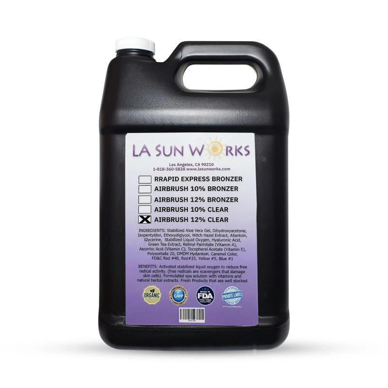DHA 10%, shower after 4-6+ hours, for a medium dark spray tan, for most skin types including 1 through 5 skin types. For all airbrush, HVLP, automatic sprayer systems. (Custom and private/white label solutions available.)