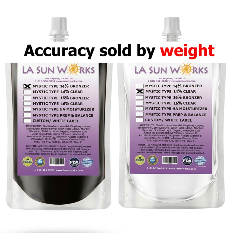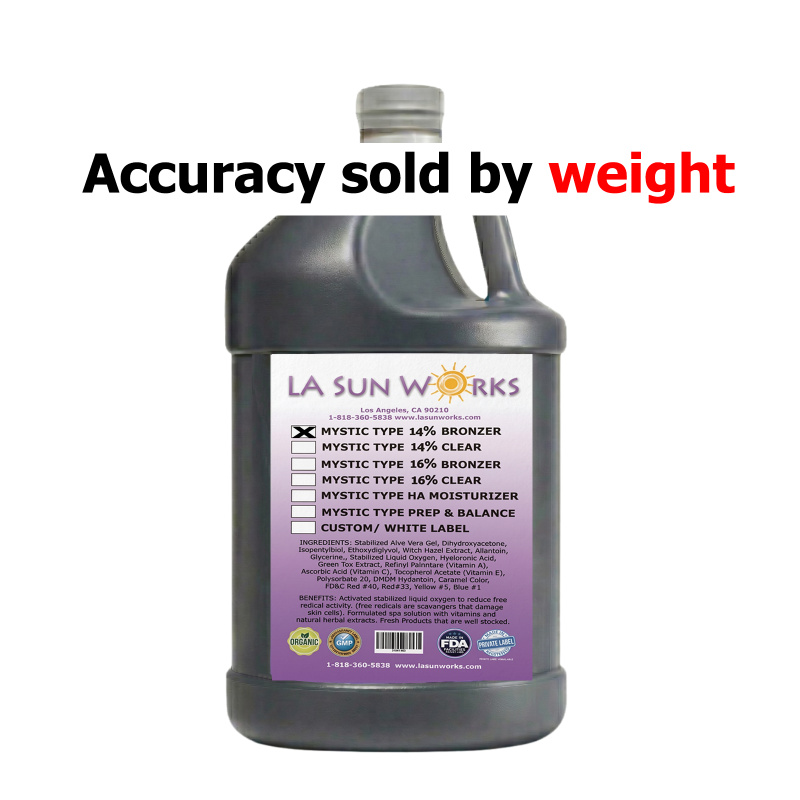 Benefits: Premium (Mystic Tan type) 14% DHA Self Tanner Eco-Cert., Non Drying (Aloe Vera 20% ), No turning green, Stabilized for shelf life (1 year), Activated Stabilized Liquid Oxygen to reduce free radical activity, Fortified Vitamins A,C,E. and Herbal Extracts, Automatic Booth Solution - 10% DHA With Bronzers, Paraben Free, Non-Comedogenic & Gluten Free