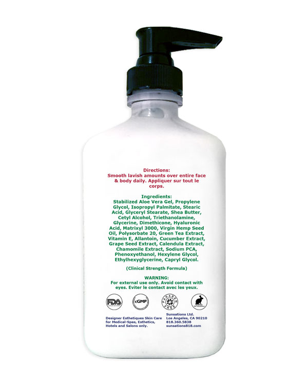 Stabilized Aloe Vera Gel, Propylene Glycol, Isopropyl Palmitate, Stearic Acid, Glyceryl Stearate, Shea Butter, Cetyl Alcohol, Triethanolamine, Glycerine, Dimethicone, Hyaluronic Acid, Matrixyl 3000, Virgin Hemp Seed Oil, Polysorbate 20, Green Tea Extract, Vitamin E, Allantoin, Cucumber Extract, Grape Seed Extract, Calendula Extract, Chamomile Extract, Sodium PCA, Phenoxyethanol, Hexylene Glycol, Ethylhexyglycerine, Capryl Glycol.